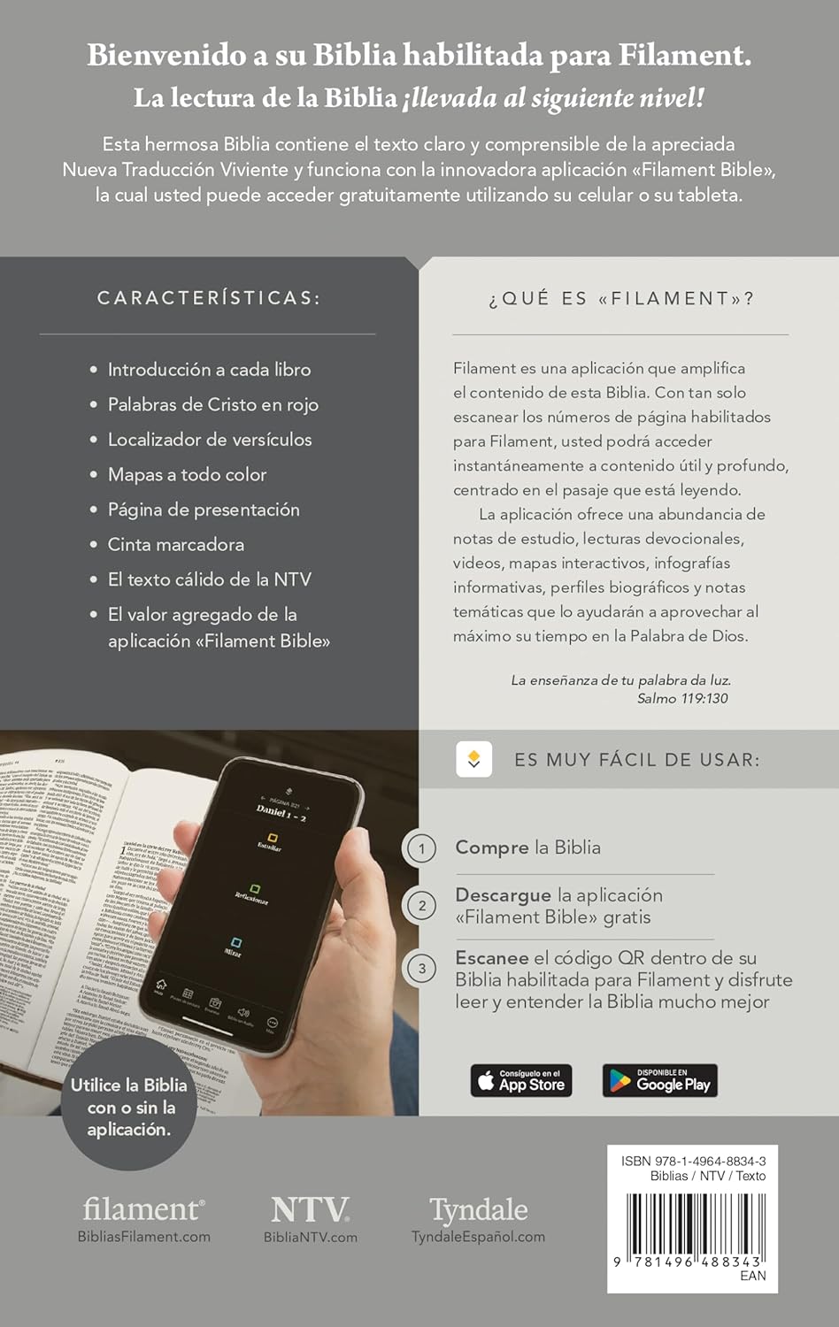 La nueva Biblia manual NTV con Filament de Tyndale ofrece un texto legible, un diseño atractivo en una Biblia con un tamaño fácil de transportar. Esta edición es ideal para la lectura desde el púlpito y conveniente para la lectura persona. Y aunque tiene el mismo precio cómodo de las Biblias básicas de texto, la Biblia manual NTV ofrece mucho más, al incluir la innovadora aplicación «Filament Bible». Esta aplicación le permite utilizar su teléfono móvil o tableta para conectar cada página a una amplia gama de contenido relacionado con la Biblia.