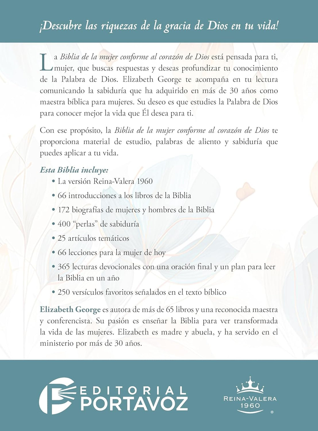 La Biblia de la mujer conforme al corazón de Dios está pensada para ti, mujer, que buscas respuestas y deseas profundizar tu conocimiento de la Palabra de Dios. Elizabeth George te acompaña en tu lectura comunicando la sabiduría que ha adquirido en más de 30 años como maestra bíblica para mujeres. Su deseo es que estudies la Palabra de Dios para conocer mejor la vida que Él desea para ti.