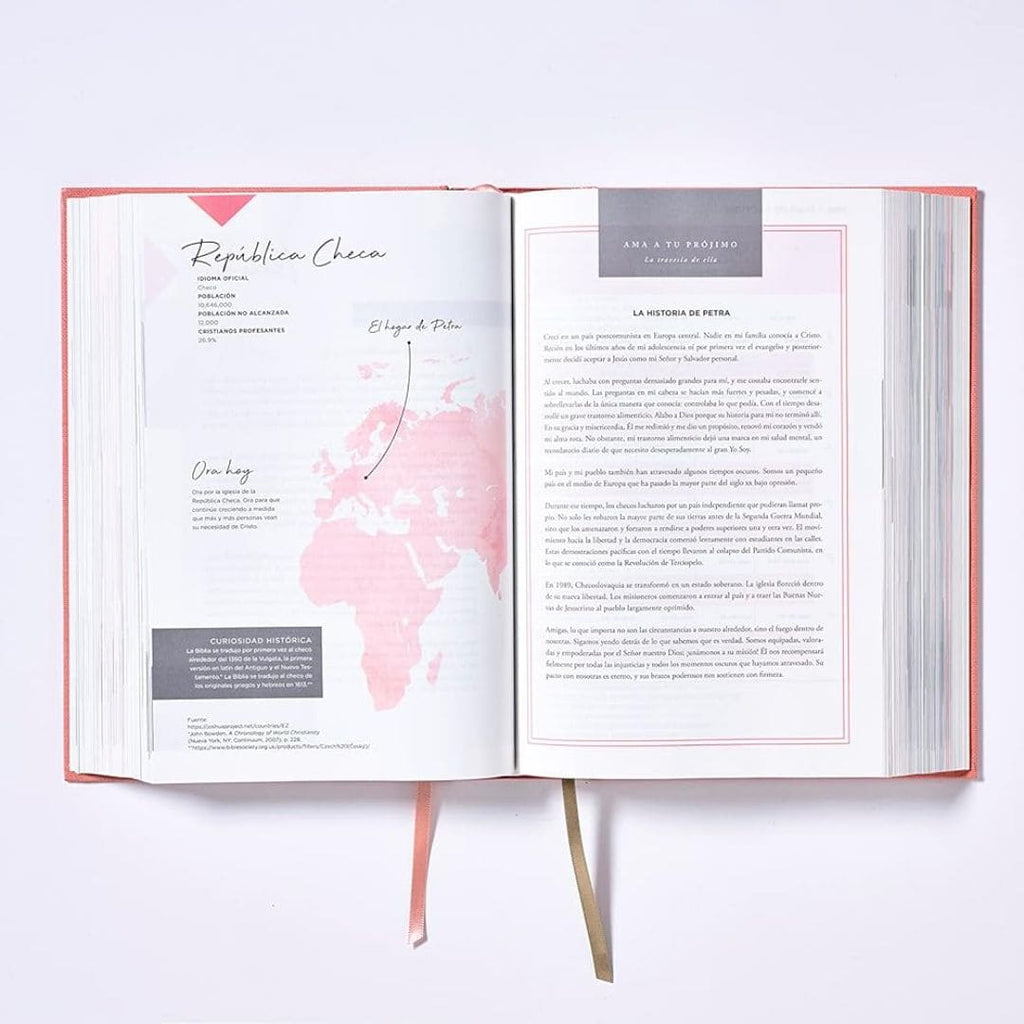 Esta Biblia anima y equipa a las mujeres para que se encuentren con Dios en las páginas de las Escrituras. Cada elemento de esta Biblia está bellamente diseñado para ayudarte a comprometerte con la Palabra de Dios para que puedas conocer el amor permanente de un Dios fiel.